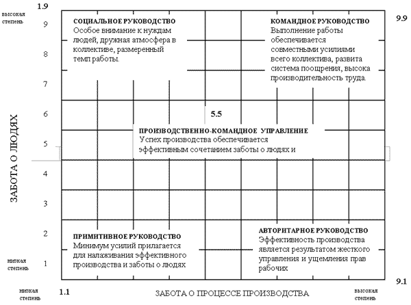 Концепция, разработанная в университете штата Огайо, была модифицирована и популяризована Блэйком и Мутоном, которые построили решетку (схему), включавшую 5 основных стилей руководства: социальное, командное, производственно-командное, примитивное, авторитарное. Вертикальная ось этой схемы ранжирует “заботу о человеке” по шкале от 1 до 9. Горизонтальная ось ранжирует “заботу о производстве” также по шкале от 1 до 9. Стиль руководства определяется обоими этими критериями.