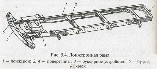 На переднем конце рамы установлены буфер 5 и буксирные крюки 6. Буфер предназначен для восприятия толчков и ударов при наездах и столкновениях. Крюки служат для буксирования автомобиля. В задней части рамы грузового автомобиля расположено буксирное (прицепное) устройство 3, предназначенное для присоединения к автомобилю прицепов, буксируемых автомобилей и т.д. Буксирное устройство включает крюк с запорным устройством и пружину или резиновый амортизатор, которые смягчают толчки и удары при движении автомобиля с буксиром по неровной дороге, при торможении и трогании с места.