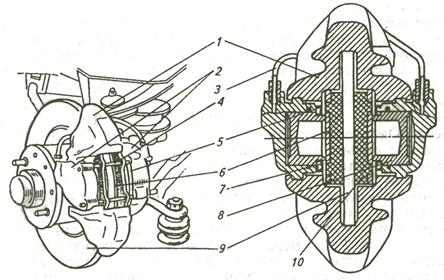 1– скоба; 2 – тормозные цилиндры; 3 – трубопровод; 4 – палец; 5 – защитный чехол; 6 – тормозная колодка; 7 – уплотнительное кольцо; 8 – поршень; 9 – диск; 10 – фрикционная накладка.