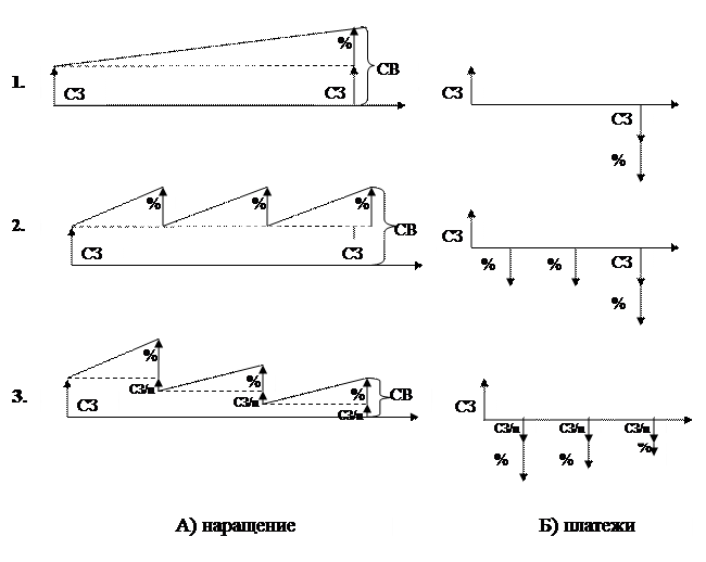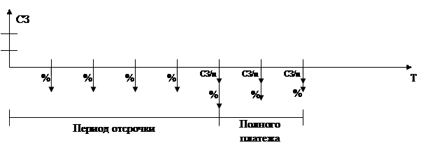 Фактически данная схема представляет собой в первой части (периоды отсрочки) вторую схему займа – периодичного платежа процентов и разового возврата, а завершающая часть составляет третью схему – схему равномерного возврата суммы займа и периодичной проплаты процентов.