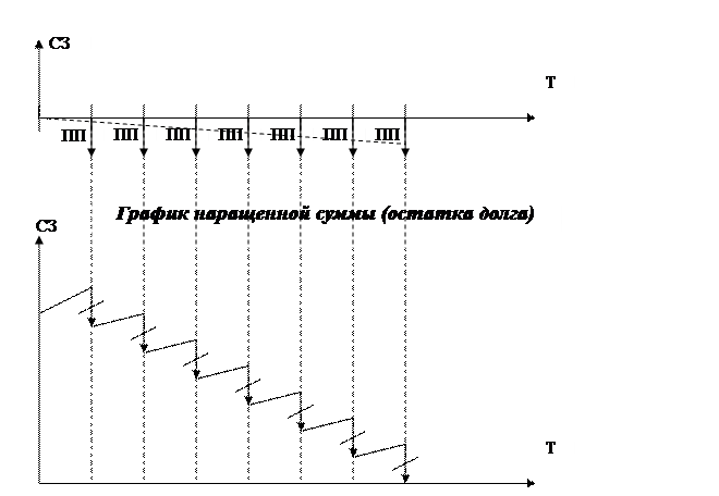 Стрелки вниз равны периодичному платежу, а наклонные линии наращения за расчетные периоды (меняют наклон).