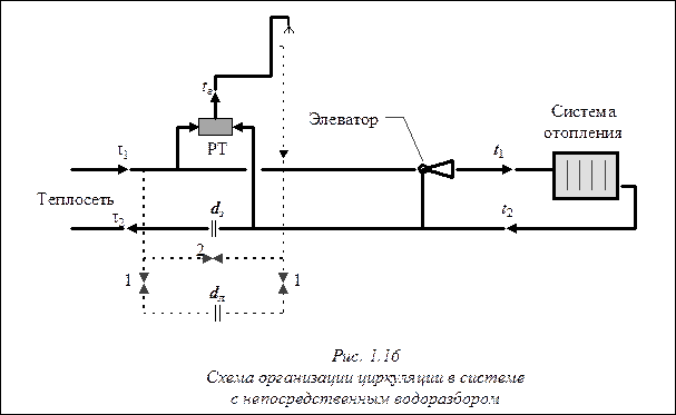 В системах с непосредственным водоразбором из теплосети на нужды горячего водоснабжения (открытые системы теплоснабжения) циркуляция организуется установкой двух диафрагм (суживающих устройств). Это так наз. "зимняя" (dз) и "летняя" (dл) диафрагмы (рис. 1.16).