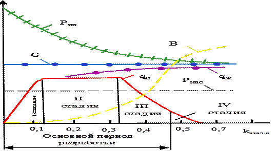 Процесс вытеснения нефти водой из пласта аналогичен водонапорному режиму, однако вследствие менее благоприятных геолого-физических условий доля неизвлекаемых запасов по сравнению с водонапорным режимом несколько возрастает. Динамика показателей разработки при упруговодонапорном режиме (рис2.6) имеет и сходство с динамикой водонапорного режима, и отличия от нее.