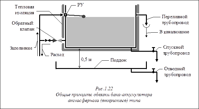 Наиболее сложна обвязка открытого бака (рис. 1.22). Сам бак устанавливается над поддоном (для сбора возможных переливов). В общем случае открытый бак оборудуется следующими трубопроводами: