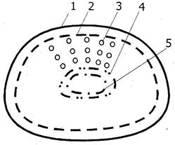 1 — внешний контур нефтеносности; 2 — внутренний контур нефтеносности; 3 — добывающие скважины; 4 — внешний контур газоносности; 5 —внутренний контур газоносности