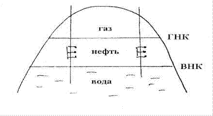 В сводовой газонефтяной залежи, подстилаемой водой, в каждой скважине должно выбираться оптимальное положение интервала перфорации, при котором нижние перфорационные отверстия находятся на определенном удалении от ВНК, а верхние от ГНК. Обоснование оптимального положения интервала перфорации обычно производится расчетным или опытным путем.