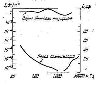 принимается равной 10-12 Вт/м2, так что порог слышимости при частоте порядка 1000 Гц лежит на нулевом уровне (L = 0).,