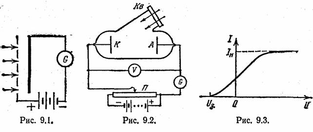 Свет, проникающий через кварцевое окошко Кв освещает катод К, изготовленный из исследуемого материала. Электроны, испущенные вследствие фотоэффекта, перемещаются