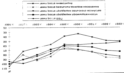 В изменении структуры белорусской экономики выделяются два этапа. 1991-1995гг. – этап пассивной структурной перестройки. Он характеризуется кризисными процессами – спадом производства, ростом инфляции, увеличением безработицы и падением уровня жизни. Структурные изменения стихийны: свертывание производства, понижение интенсивности хозяйственной деятельности из-за потери рынков сбыта, удорожания сырья и топлива, нерентабельности производства.
