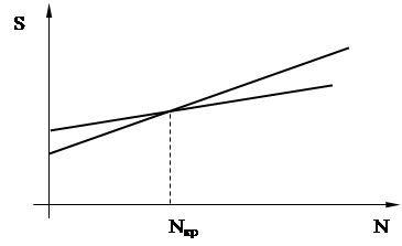 Определим критический объем производства Nкр. Для случая N< Nкр экономически целесообразен первый технологический процесс. Для случая N>Nкр – второй технологический процесс. При Nкр S1=S2,