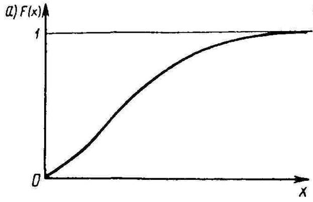 Рис. 5. Интегральная (а) и дифференциальная (б) функции распределения: F(x)-вероятность отказа; f(x)-плотность вероятности отказа