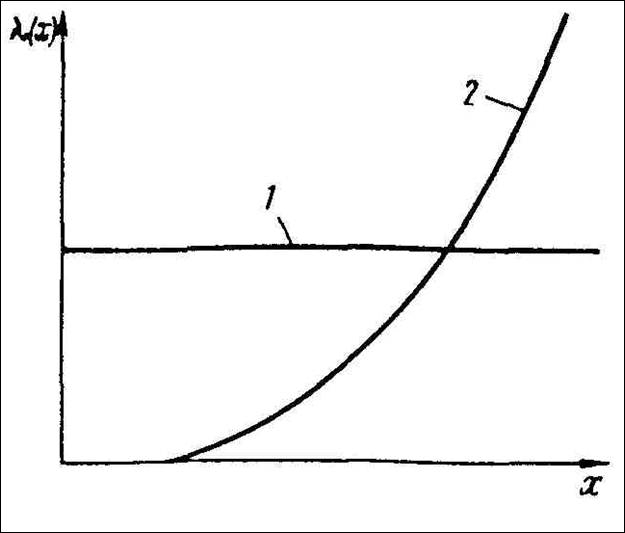 Рис 6. Изменение интенсивности отказов для внезапных(1) и постепенных (2) отказов.