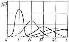 Отказы начинают возникать с момента l -3σ и к моменту l +3σ заменится всё первое поколение деталей. Детали второго поколения вводятся постепенно. Максимум будет на пробеге 21, но его величина приблизительно в два раза меньше, так как кривая приблизительно в два раза шире, а σ2=2σ1. С момента 2 l -3σ2 начинают вводиться детали третьего поколения деталей. Его максимум будет при 3 l. Практически с этого иомента. f(l)- становится постоянным. Для случая нормального закона. f(l) =const начиная с значения l*l /3σ, для других законов распределения стабилизация наступает ещё быстрее. С этого момента интенсивность отказов постоянна, а потому закон распределения экспоненциальный, следовательно износовые (постепенные) отказы проявляют себя так же, как и внезапные.