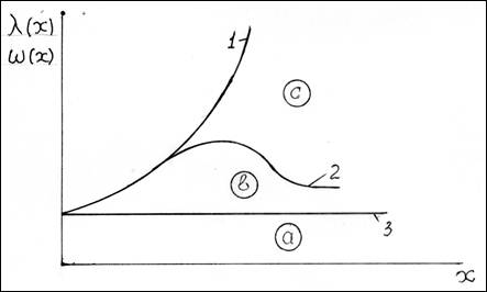 1-интенсивность отказов неремонтируемых систем, 2- интенсивность отказов ремонтируемых систем (линия идеального ремонта), 3- интенсивность внезапных отказов, а-зона внезапных отказов, в-зона профилактики, с-зона ремонтов. Рис. 9. Профилактика и ремонт машин
