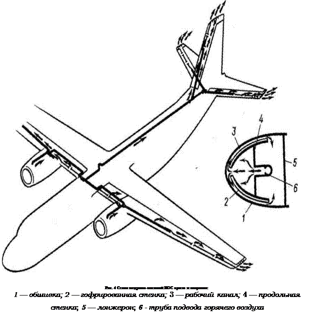 Воздушно-тепловые системы (Рис.4) широко применяются для обогрева передних кромок крыла, стабилизатора, киля и чаще всего - для обогрева воздухозаборников двигателей. Устройство каналов для прохождения горячего воздуха в крыле и оперении в принципе одинаково. В носке крыла по всей его длине между обшивкой и внутренней гофрированной стенкой образованы рабочие каналы, в которые горячий воздух поступает из канала, ограниченного продольной стенкой. Из рабочих каналов воздух выходит в пространство между продольной стенкой и передним лонжероном и в концевой части крыла выводится в атмосферу. При наличии на крыле предкрылка обогревается предкрылок. Воздух к нему поступает из носка крыла через телескопическое соединение (Рис.6). При убранном предкрылке воздух сбрасывается в атмосферу через крыло, при выпущенном - непосредственно из предкрылка; при этом отверстия в носке крыла для выхода воздуха в атмосферу закрываются пружинными клапанами.