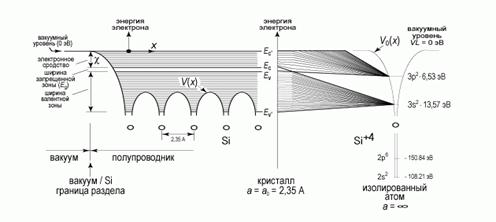 При сближении атомов потенциальные кривые частично налагаются друг на друга (штриховая линия рис. 1.1,б) и дают результирующий потенциальный рельеф (сплошные линии) с пониженными потенциальными барьерами между атомами. Говорят, что валентные электроны обобществляются, и каждый электрон теперь принадлежит всему кристаллу.