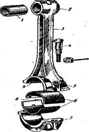 Нижняя головка шатуна служит для соединения его с шатунной шейкой кривошипа коленчатого вала. Для возможности сборки шатуна с валом нижнюю головку делают разъемной. Крышку 7 крепят к шатуну двумя шатунными болтами 4. Чтобы избежать ослабления крепления, гайки шатунных болтов стопорят при помощи шплинтов или стопорными шайбами. В нижней головке располагают шатунный подшипник.