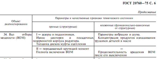 | 34. Вал отбора мощности (ВОМ) | I — зазоры в подшипниках. Износ шестерен и посадочных поверхностей корпуса редуктора. Толщина дисков муфты сцепления | Параметры вибрации и шума. Концентрация продуктов изнашивания трущихся деталей в масле |