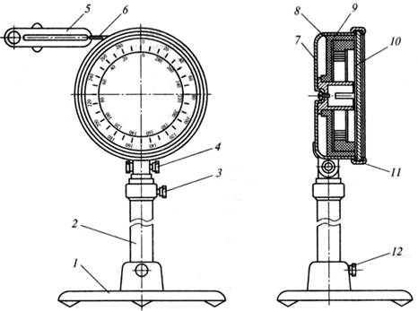 1 — основание; 2 — стойка; 3, 4, 12 — зажимные винты; 5 — зажим; 6 — нить; 7— корпус; 8 — барабан; 9 — спиральная пружина; 10 — шкала; 11 — поворотное кольцо