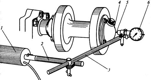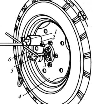 Проверка и регулировка осевого зазора в подшипниках. С помощью приспособления КИ-4850, устанавливаемого на колесо (рисунок 4), проверяют и регулируют осевой зазор в подшипниках. Электромагнит 2 приспособления подключают к аккумуляторной батарее трактора и закрепляют приспособление с помощью электромагнита на диске у колеса. Индикатор 5 приспособления устанавливают так, чтобы конец штока 3 упирался в торец цапфы. Перемещая колесо в осевом направлении, определяют по показанию индикатора осевой зазор в подшипниках колеса.