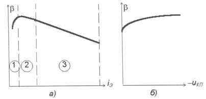Спад β в области малых токов эмиттера (область 1) обусловлен рекомбинацией носителей заряда в ОПЗ эмиттера, а спад в области больших токов (область 3) – уменьшением коэффициента инжекции.