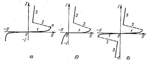 Динисторы и тринисторы могут иметь ВАХ трех типов (рис. 7.8). Непроводящие в обратном направлении тиристоры при подаче отрицательного анодного напряжения не переключаются и оказываются закрытыми (рис. 7.8,а). Проводящие в обратном направлении тиристоры также не переключаются при подаче обратного напряжения, но проводят токи сравнимые с токами в открытом состоянии в прямом направлении (рис. 7.8,б). Симметричные тиристоры – симисторы – имеют одинаковые характеристики переключения в первом и третьем квадрантах ВАХ (рис. 7.8,б).