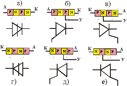 На рис. 7.9 приведены примеры некоторых возможных структур тиристоров и их графические обозначения.
