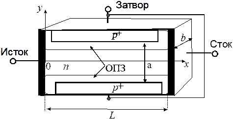 Он состоит из пластины полупроводника n-типа, к торцам которой присоединены сток и исток; к боковым граням пластины присоединяется затвор; между pn -переходами располагается канал ПТУП, который имеет следующие геометрические размеры: L – длина, d -толщина и b – ширина.