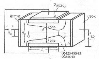 Канал ограничен сильно легированной p-областью образующей тело затвора, потенциал которого задается с помощью внешнего контакта. При отсутствии напряжения на затворе сопротивление канала мало, говорят, что ПТУП – нормально открытый прибор.