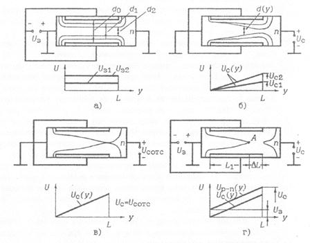 | Рис.8. Форма канала при различных значениях напряжений на затворе и стоке а) Uc мало, Uз изменяется; б) Uз=0, Uc изменяется; в) Uз=0, Uc= Ucотс; г) Uc+ Uз> Ucотс |