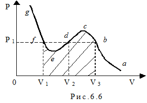 Работа при изотермическом сжатии по изотерме Ван-дер-Ваальса от объёма V3 до объёма V1 численно равна площади заштрихованной криволинейной трапеции на рис.6.6.
