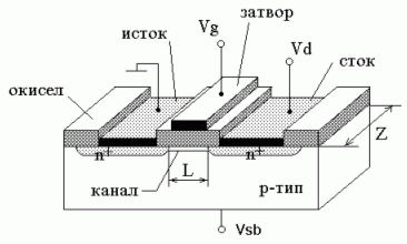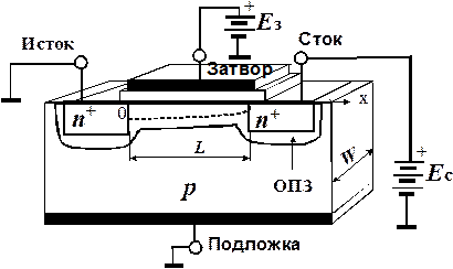 Проводящий канал расположен между стоком и истоком. Расстояние между областями стока и истока определяет длину канала L.