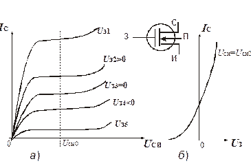 Как видно из графиков, на характеристиках МДП-транзистора можно выделить две области: участок крутого нарастания тока стока Ic с увеличением напряжения U си и пологий участок, на котором Ic меняется незначительно, поэтому эту область часто моделируют горизонтальными прямыми вплоть до напряжения пробоя.