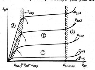 2 – активная область (пологая часть выходных ВАХ U з> U п, U си >U си гр) – область, где ток Ic остается практически неизменным с ростом напряжений U си.