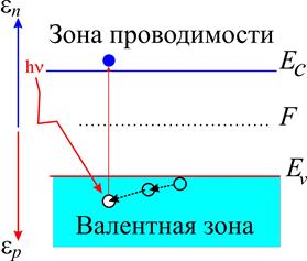 Энергия дырки отсчитывается от Ev, иногда от уровня Ферми, чем большей энергией обладает дырка, тем ниже от Ev она опускается. Дырки с минимальной энергией будут скапливаться у потолка валентной зоны, электроны - у дна зоны проводимости. Отметим, что положение Eс и Ev не всегда совпадают в