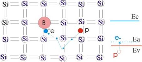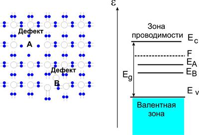 Для управления электрическими свойствами полупроводников в них специально вводят примеси (легируют). Необходимо подчеркнуть, что при замещении атома кристалл остается электронейтральным! Только при ионизации атомов примеси, например, при введении в полупроводник IV группы периодической системы элементов (например, Si) примеси элементов V группы – доноров появляются дополнительные электроны, введение элементов III группы – акцепторов – приводит к появлению дополнительных дырок.