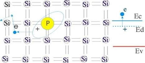 На рис.2.5 показана схема решетки кристалла Si, в который введен фосфор (V группа). Элемент V группы имеет 5 валентных электронов, четыре из них образуют связи с соседними атомами Si, пятый электрон связан только с атомом примеси, и эта связь слабее остальных, поэтому при нагреве кристалла пятый электрон отрывается первым, при этом атом фосфора приобретает положительный заряд, становясь ионом