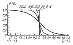 Энергия Ферми служит некоторой границей, разделяющей заполненные и незаполненные состояния системы. Действительно, вероятность заполнения энергетического уровня с энергией Ферми (Е=F) согласно (1.18) составляет: f(F)= ½. Все состояния с энергией меньшей энергии Ферми имеют вероятность заполнения больше ½. Все состояния находящиеся выше уровня Ферми имеют вероятность заполнения меньше ½. На рис.1.6 приведена зависимость f(E), рассчитанная для различных температур.