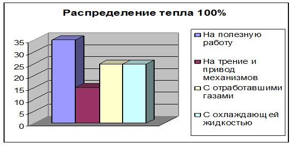 Тепловой баланс может быть представлен в виде диаграммы (рис. 4.1.), из которой видно, что на полезную работу двигателя используется от 25 до 35 % общего количества тепла и, следовательно, эффективный коэффициент полезного действия двигателя равен 0,25-035.
