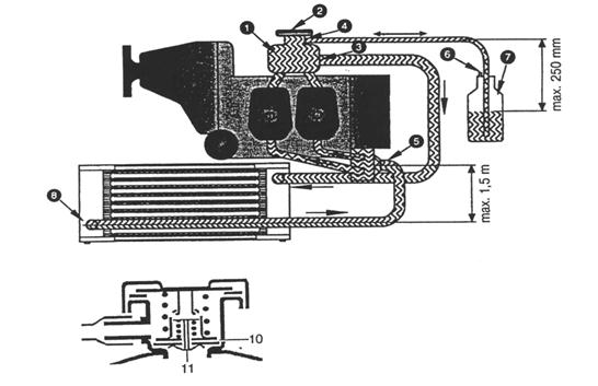 Насос имеет четыре раздаточных штуцера, ввернутых в корпус, которые с помощью шлангов соединяются с нижними патрубками рубашек охлаждения головок (рис. 4.6.). Для отвода жидкости в верхней части рубашек расположены отводные штуцеры, которые с помощью шлангов соединяются с приемными патрубками расширительного бачка-аккумулятора. Бачок являясь верхней точкой системы охлаждения, имеет клапанную крышку, которая регулирует соединение с переливной емкостью (рис. 4.5.). При нагреве охлаждающей жидкости происходит ее расширение, что вызывает повышение давления в системе. Выпускной клапан открывается когда давление в системе больше чем 0,9 МПа и через переливной штуцер часть жидкости попадает в бачок переполнения. При охлаждении жидкости происходит ее сжатие и в системе создается разрежение. Впускной клапан в крышке открывается и жидкость, за счет разрежения возвращается в систему. Тепловой режим двигателя должен контролироваться по температуре головки цилиндра. Датчик температуры устанавливается в отверстие более горячей головки цилиндров. В качестве основного параметра используется температура температуры головки.