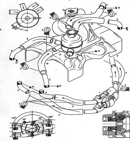 Охлаждающая жидкость из нижней точки радиатора подается водяным насосом в рубашки охлаждения головок, затем поступает в расширительный бачок и возвращается в радиатор.