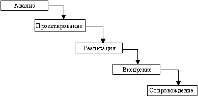 В ранних не очень больших по объему однородных информационных систем каждое приложение представляло собой единое целое. Для разработки такого типа приложений применялся каскадный способ. Его основной характеристикой является разбиение всей разработки на этапы, причем переход с одного этапа на следующий происходит только после того, как будет полностью завершена работа на текущем (рис. 2). Каждый этап завершается выпуском полного комплекта документации, достаточной для того, чтобы разработка могла быть продолжена другой командой разработчиков.