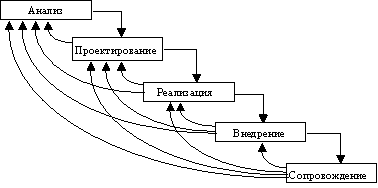 Каскадный подход хорошо зарекомендовал себя при построении информационных систем, для которых в самом начале разработки можно достаточно точно и полно сформулировать все требования, с тем, чтобы предоставить разработчикам свободу реализовать их как можно лучше с технической точки зрения. В эту категорию попадают сложные расчетные системы, системы реального времени и другие подобные задачи. Однако в процессе использования этого подхода обнаружился ряд его недостатков, вызванных прежде всего тем, что реальный процесс создания систем никогда полностью не укладывался в такую жесткую схему. В процессе создания постоянно возникала потребность в возврате к предыдущим этапам и уточнении или пересмотре ранее принятых решений. В результате реальный процесс создания программного обеспечения принимал следующий вид (рис. 3):