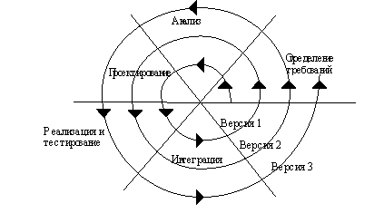 Для преодоления перечисленных проблем была предложена спиральная модель жизненного цикла (рис. 4), делающая упор на начальные этапы жизненного цикла: анализ и проектирование. На этих этапах реализуемость технических решений проверяется путем создания прототипов. Каждый виток спирали соответствует созданию фрагмента или версии программного обеспечения, на нем уточняются цели и характеристики проекта, определяется его качество и планируются работы следующего витка спирали. Таким образом, углубляются и последовательно конкретизируются детали проекта и в результате выбирается обоснованный вариант, который доводится до реализации.