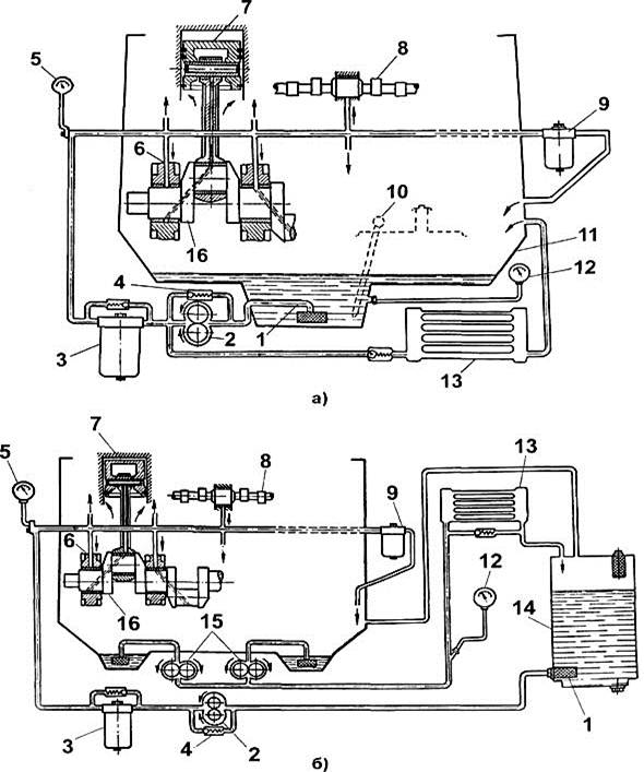 1 - маслоприемник; 2 - нагнетающий насос; 3, 9 - фильтры; 4 - редукционный клапан; 5 - манометр; 6 - подвод масла к коленчатому валу; 7 - поршень; 8 - распредвал; 10- щуп; 11- картер; 12 - указатель температуры; 13 - радиатор; 14 - бак; 15 - откачивающий насос; 16 - коленчатый вал.