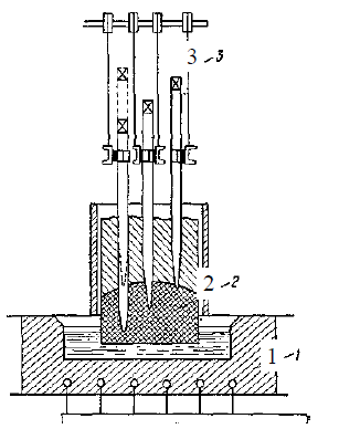 Анод из нефтяного или смоляного кокса и каменноугольного пека 2 снаружи имеет кожух из тонких листов алюминия, который по мере необходимости наращивается сверху коробками и заполняется анодной массой. По мере опускания анода механизмом 3 анодная масса постепенно спекается и становится твердой. Подвод тока к аноду осуществляется сверху от анодной линии через стальные штыри, забиваемые в анод. Штыри перемещаются также с помощью механизма 3. На дне ванны укладывают углеродистые блоки 1, к которым подается ток от катодной шины. Боковые стенки электролизера также облицовываются углеродистыми блоками.