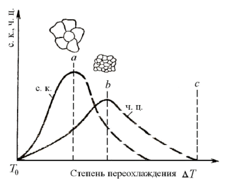 Рис. 4.6. Зависимость параметров кристаллизации от степени переохлаждения: ч. ц. – число центров кристаллизации, образующихся в единицу времени; с. к. – скорость роста кристаллов