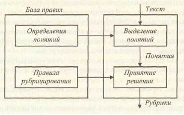 Процесс рубрицирования разбивается на два этапа. Первым из них является выделение понятий из текста, которое можно представить как процесс распознавания, основывающийся на использовании данных из базы определений. Решение о наличии понятия в тексте принимается путем вычисления справедливости выражения, определяющего понятие, относительно данного текста. Если выражение справедливо, то считается, что понятие присутствует в тексте. Кроме того, если в определении понятия присутствуют экспертные веса, то вычисляется вес или вероятность появления данного понятия в обрабатываемом тексте с учетом частоты встречаемости фраз в тексте сообщения.