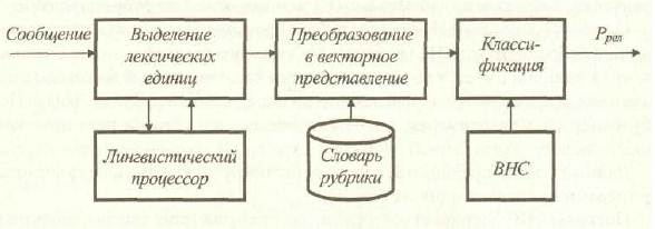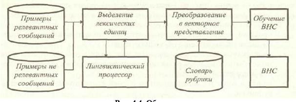 Основой нейросетевых методов рубрицирования текстов является использование нейронной сети (НС) в качестве обучаемого классификатора. Считается, что в наличии имеется подборка примеров текстов, каждый из которых помечен как релевантный или нерелевантный определенной рубрике. Задача НС, обученной на этих примерах, состоит в определении степени релевантности любого нового текста данной рубрике. Данный подход предполагает, что семантика рубрики однозначно задается примерами принадлежащих ей текстов.