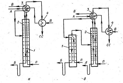 1—бражная колонна; 2 — спиртовая колонна; 3 — дефлегматор: 4 — холодильник спирта: А — бражка; Б — барда; В — вода; Л — лютерная вода; П — греющий пар; СС — спирт-сырец.